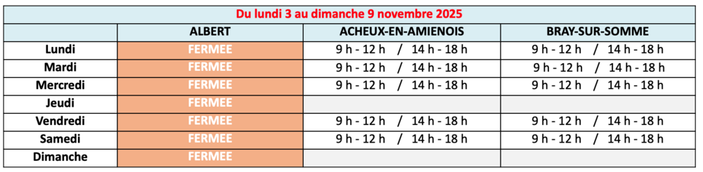La déchèterie d'Albert sera exceptionnellement fermée du 3 au 9 novembre 2025 en raison de travaux de mise aux normes. Les déchèteries de Bray-sur-Somme et d'Acheux-en-Amiénois étendent exceptionnellement leurs horaires.