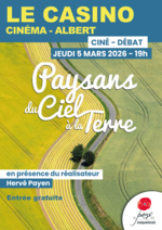 - Le 5 mars, le cinéma Le Casino d’Albert diffusera le film « Paysans du ciel à la terre » en présence d’Hervé Payen, réalisateur du film. Il animera à la suite du film-enquête un débat sur le quotidien des agriculteurs « qui cherchent chacun à leur façon, à travailler avec la vie du sol, afin de nourrir la Terre autant qu’elle nourrit les hommes ». Séance gratuite destinée à tous.