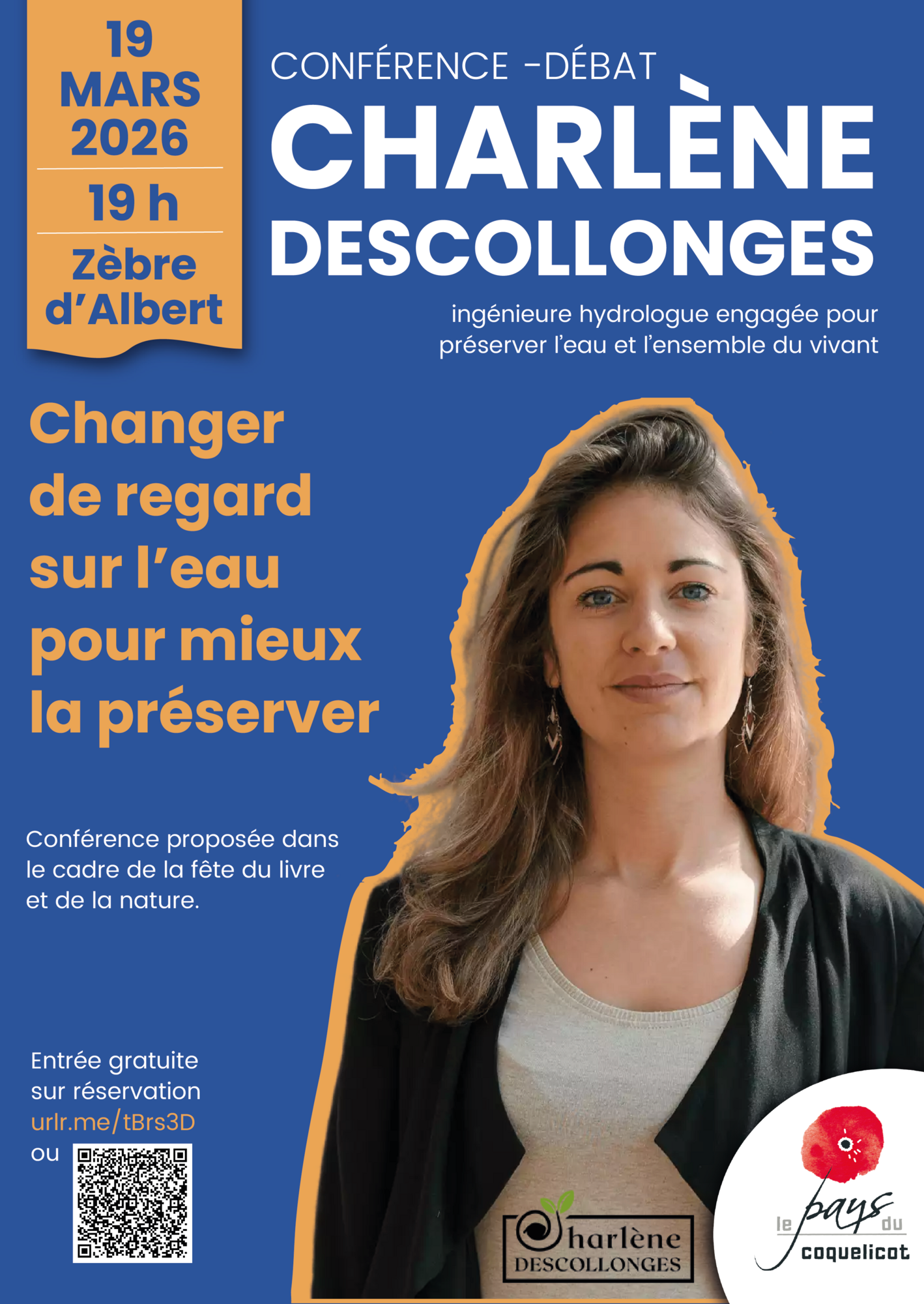 - Enfin, le 19 mars nous accueillerons au Zèbre d’Albert la conférencière Charlène Descollonges, elle ouvrira le fête du livre et de la nature par sa conférence : « Changer de regard sur l’eau pour mieux la préserver ». Cette conférence sera suivie d’un débat pour échanger collectivement sur les enjeux de l’eau sur notre territoire. Charlène Descollonges est ingénieure hydrologue, spécialisée dans la gestion de la ressource en eau et des milieux aquatiques. Conférence gratuite sur réservation via le lien urlr.me/tBrs3D